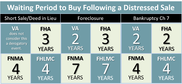 For people who have experienced a distressed sale of a home and gotten their finances and credit back in shape, there can still be an unanswered question of "How long do we have to wait to qualify for another mortgage." The loan types for the new loan will differ in amounts of time based on the event.
